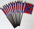 Each Confederate Battle miniature flag measures 4"x4" and is attached with a pole hem to a 10" black plastic staff with a black spear top.