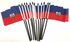 Each Haiti miniature flag measures 4"x6" and is attached with a pole hem to a 10" black plastic staff with a black or gold spear top.