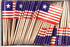 Flag toothpicks are packaged 100 to the box. Each box is sealed with a cellophane wrapper. Flag designs measure 1"x1.5" and are attached to a standard size wooden 2.5" toothpick.
