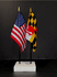 This high quality Maryland State and US miniature flag desk set is perfect for office, classroom and table decorations. Flags are made of silk-like rayon, measure 4"x6" and are attached to 10" black plastic staff with a gold spear top. All edges are hem stitched.