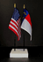 This high quality North Carolina State and US miniature flag desk set is perfect for office, classroom and table decorations. Flags are made of silk-like rayon, measure 4"x6" and are attached to 10" black plastic staff with a gold spear top. All edges are hem stitched.